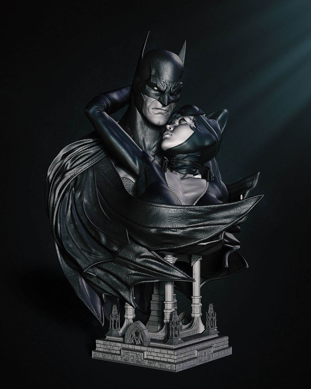 This expertly crafted figurine captures the iconic duo of Catwoman and Batman in a dramatic bust format, immortalizing their complex relationship and distinctive personas. The bust stands as a testament to their storied history within the DC Universe, featuring both characters from the shoulders up, designed to emphasize their facial expressions and iconic costumes.