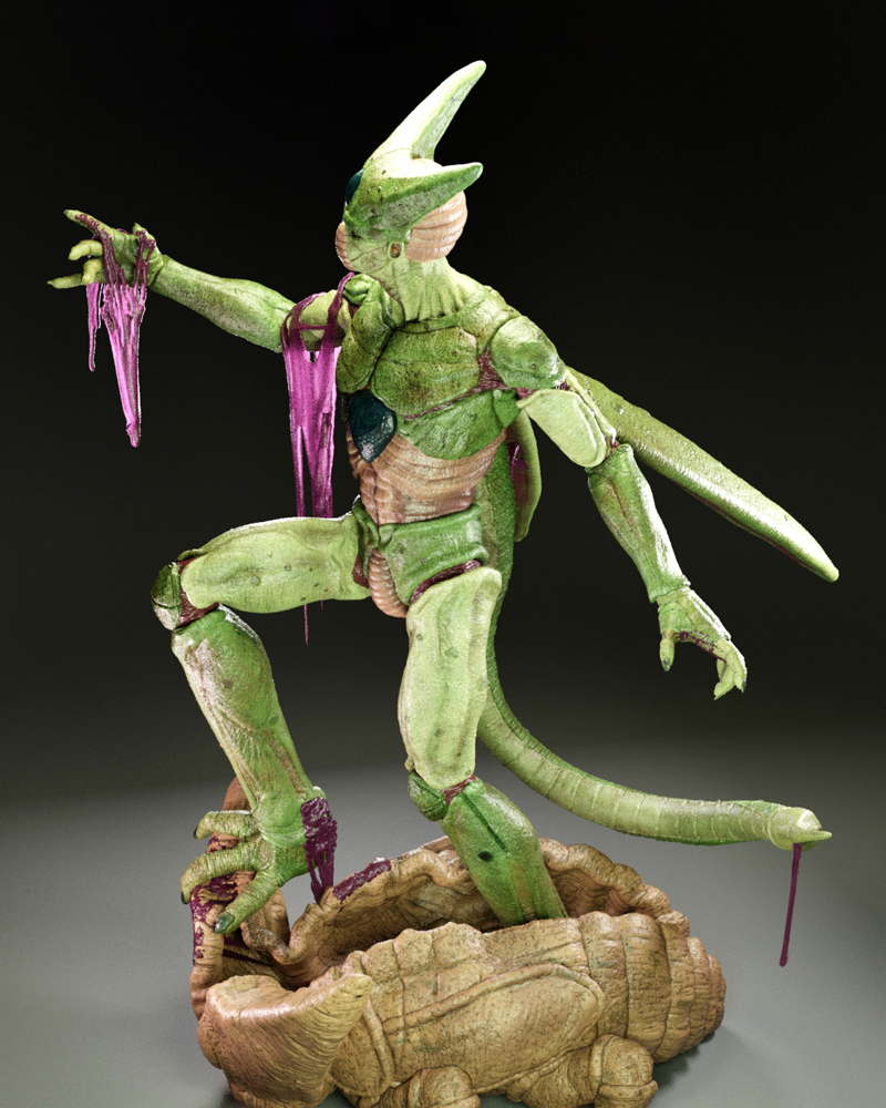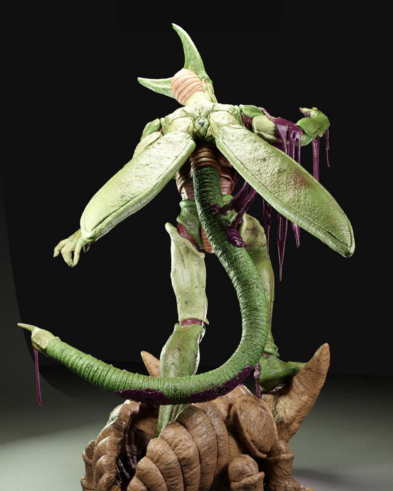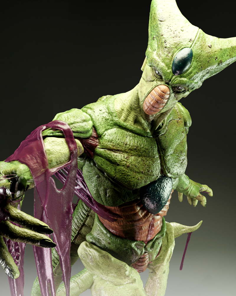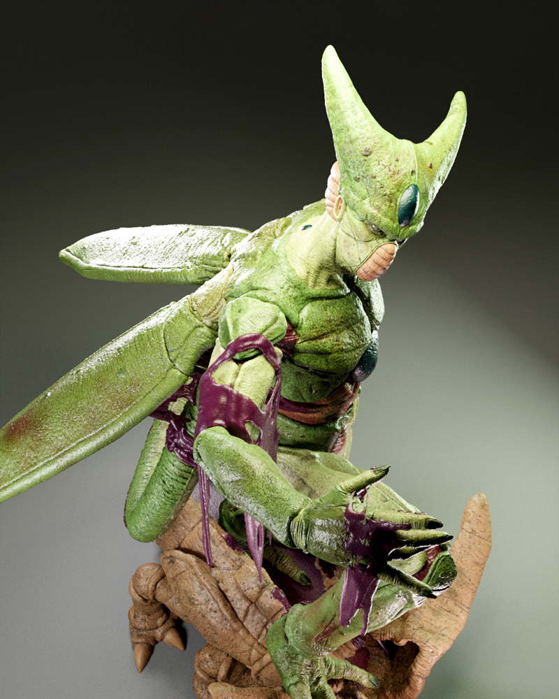 A dynamic sculpture of Cell, showcasing his menacing stance and bio-organic armor in striking detail.