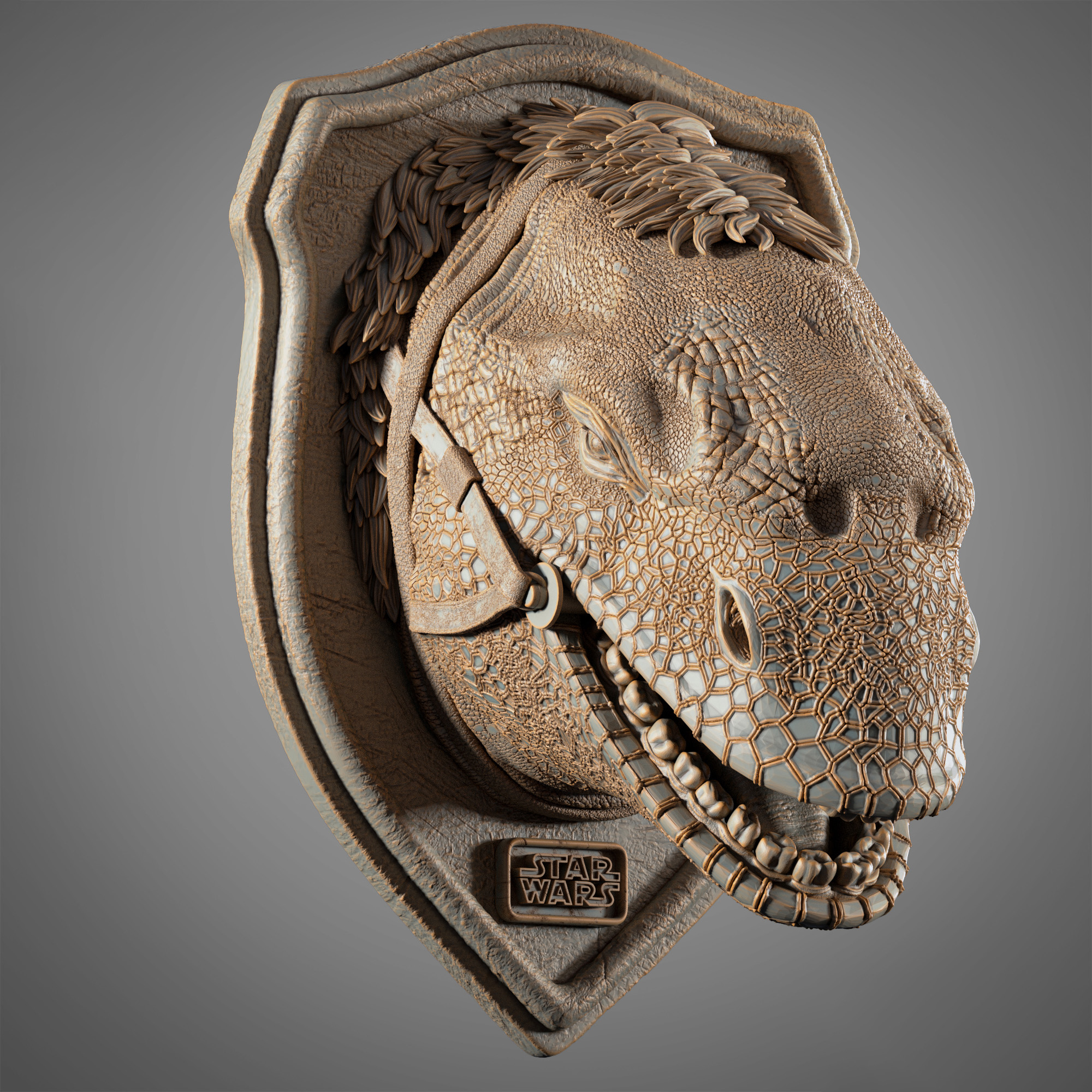 This detailed description captures the essence of the Dewback Wall Plate, reflecting the character’s iconic and formidable nature through meticulous sculpting, painting, and craftsmanship.