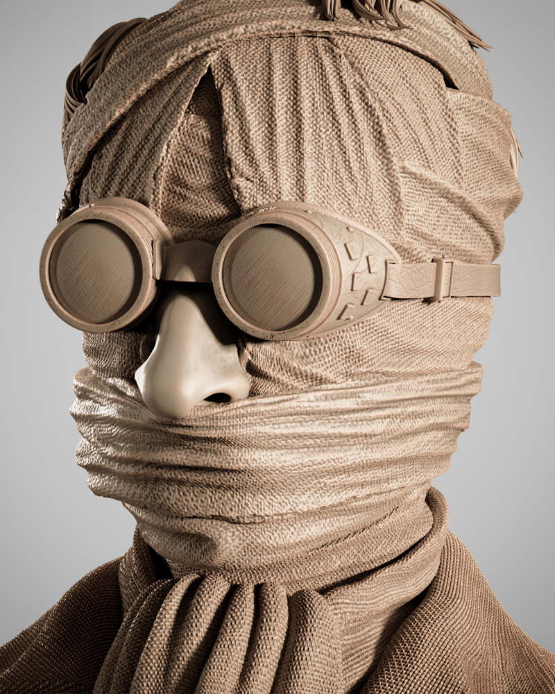 A haunting bust of the Invisible Man, featuring his iconic wrapped face, dark glasses, and fedora, frozen in eerie mid-expression.