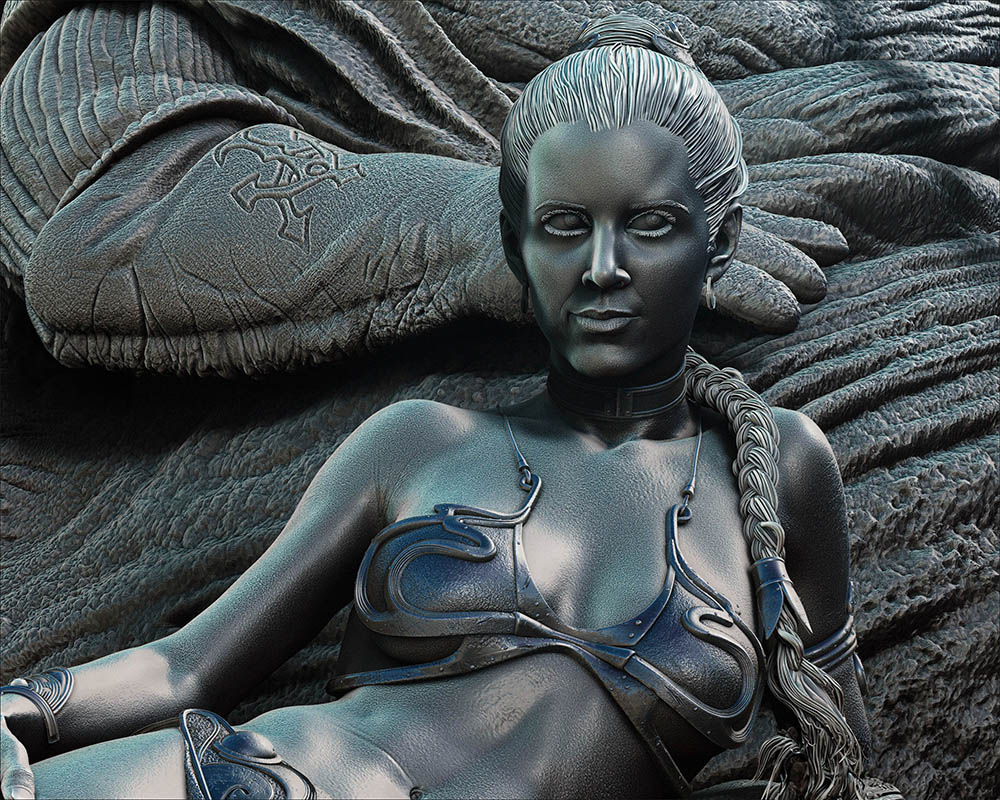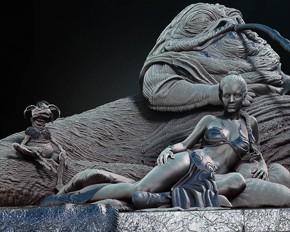 A figurine of a Leia and Jabba diorama, based on the iconic scene from Star Wars: Return of the Jedi, would be a detailed, three-dimensional representation of the characters and their surroundings.