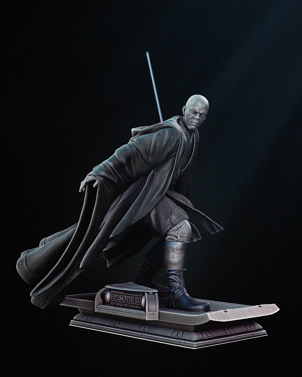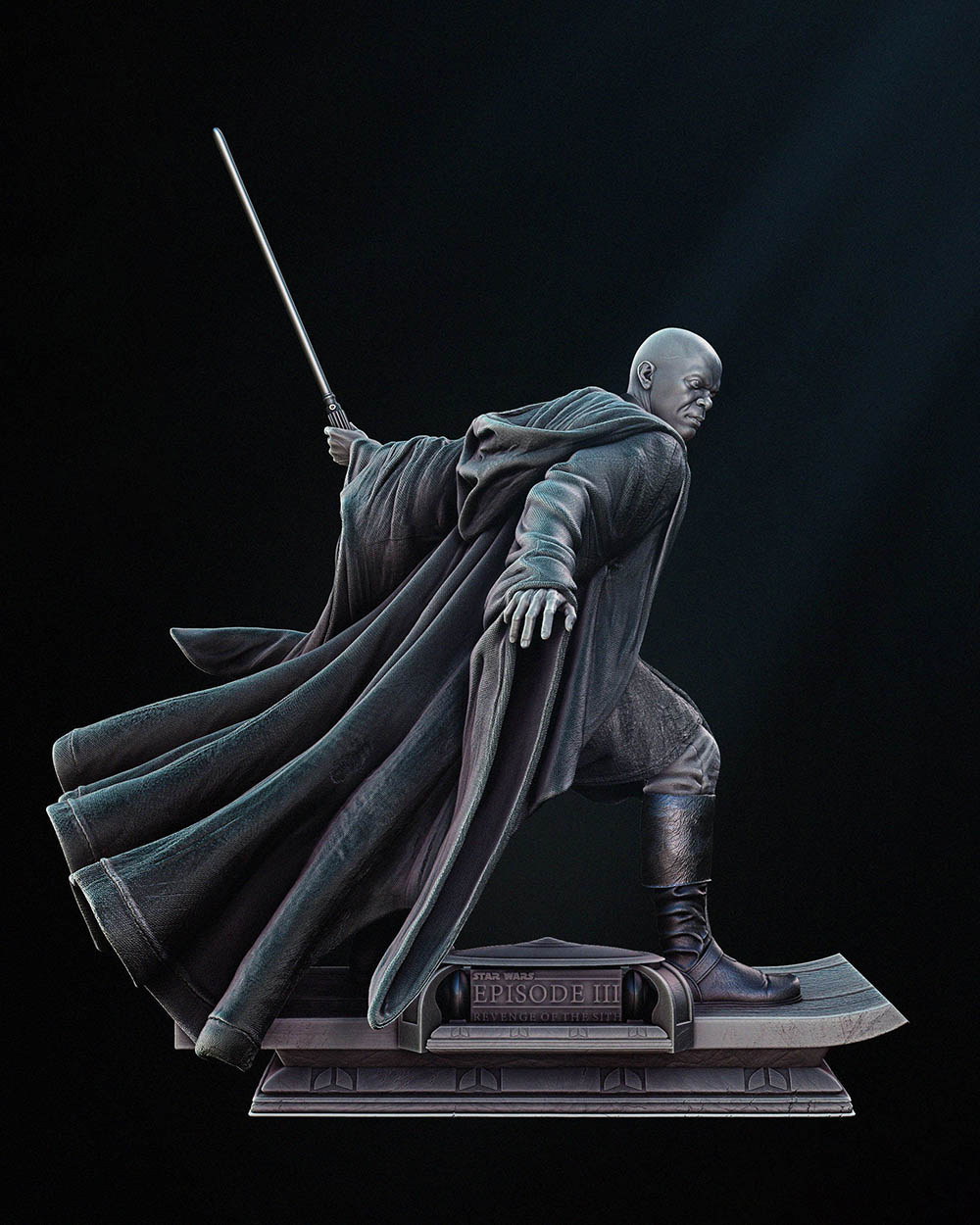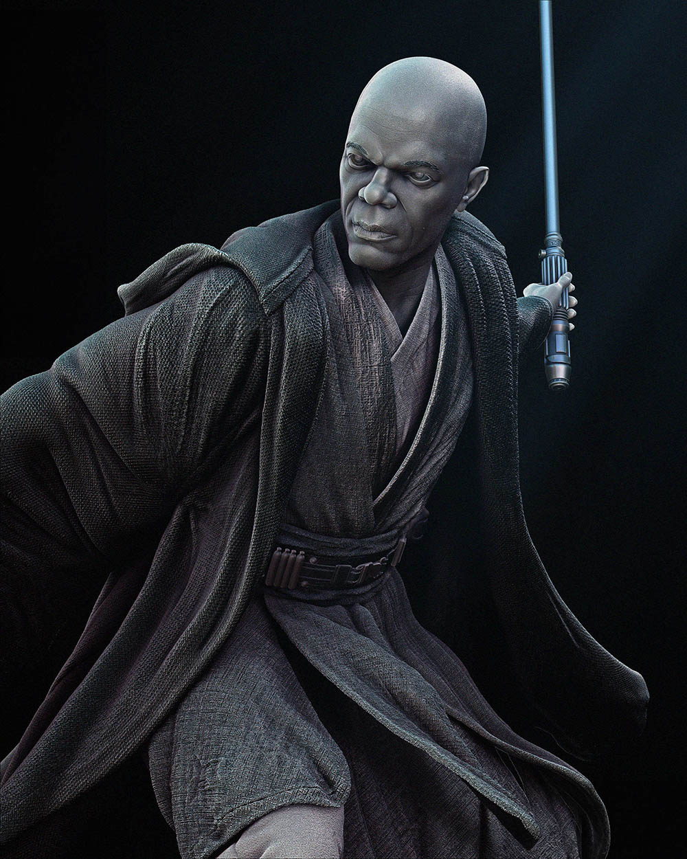 Mace Windu is portrayed in his distinctive Jedi robes, with every fold and detail meticulously sculpted to convey a sense of dignity and authority. His lightsaber, with its unique purple blade, is held firmly in hand, ready for action against the forces of darkness.