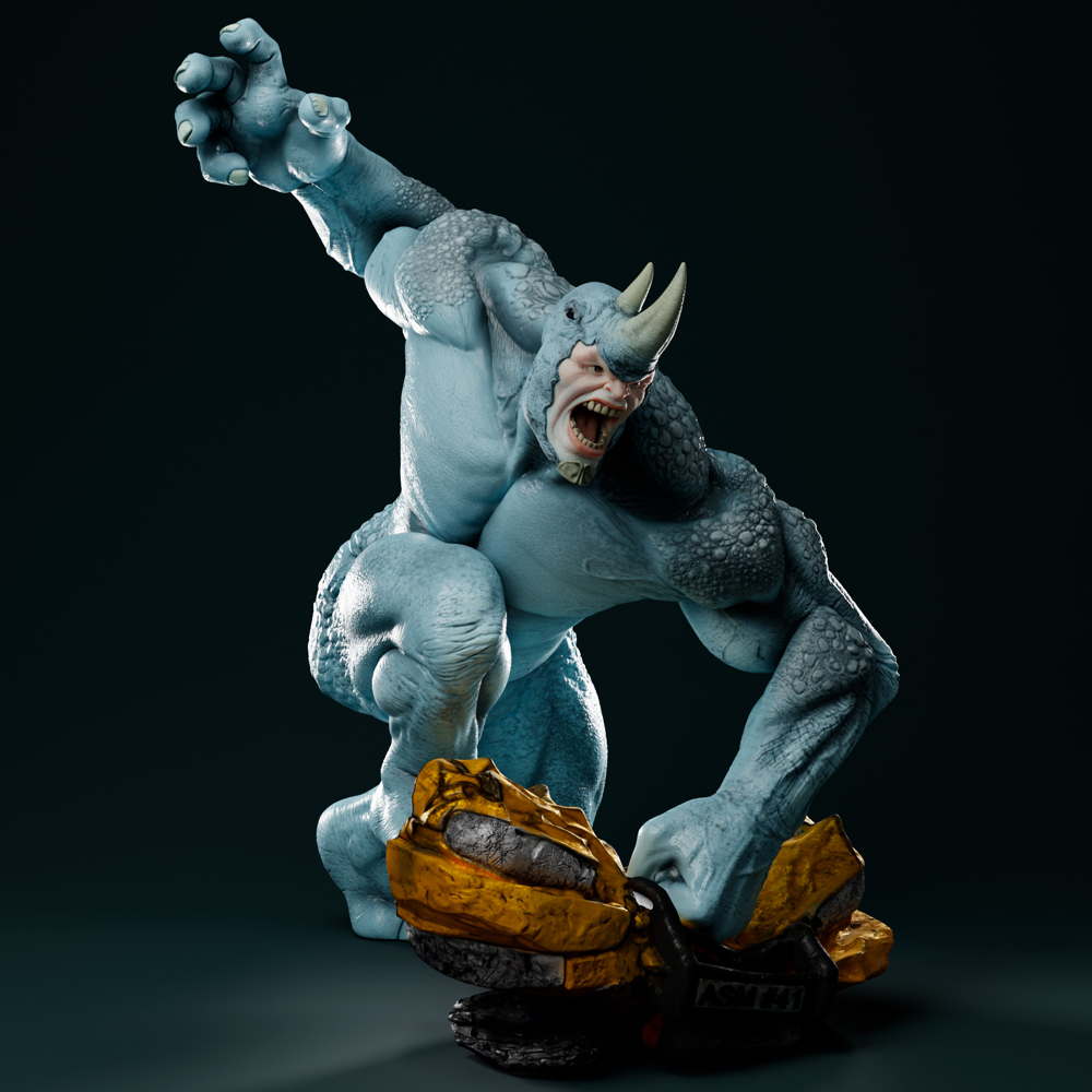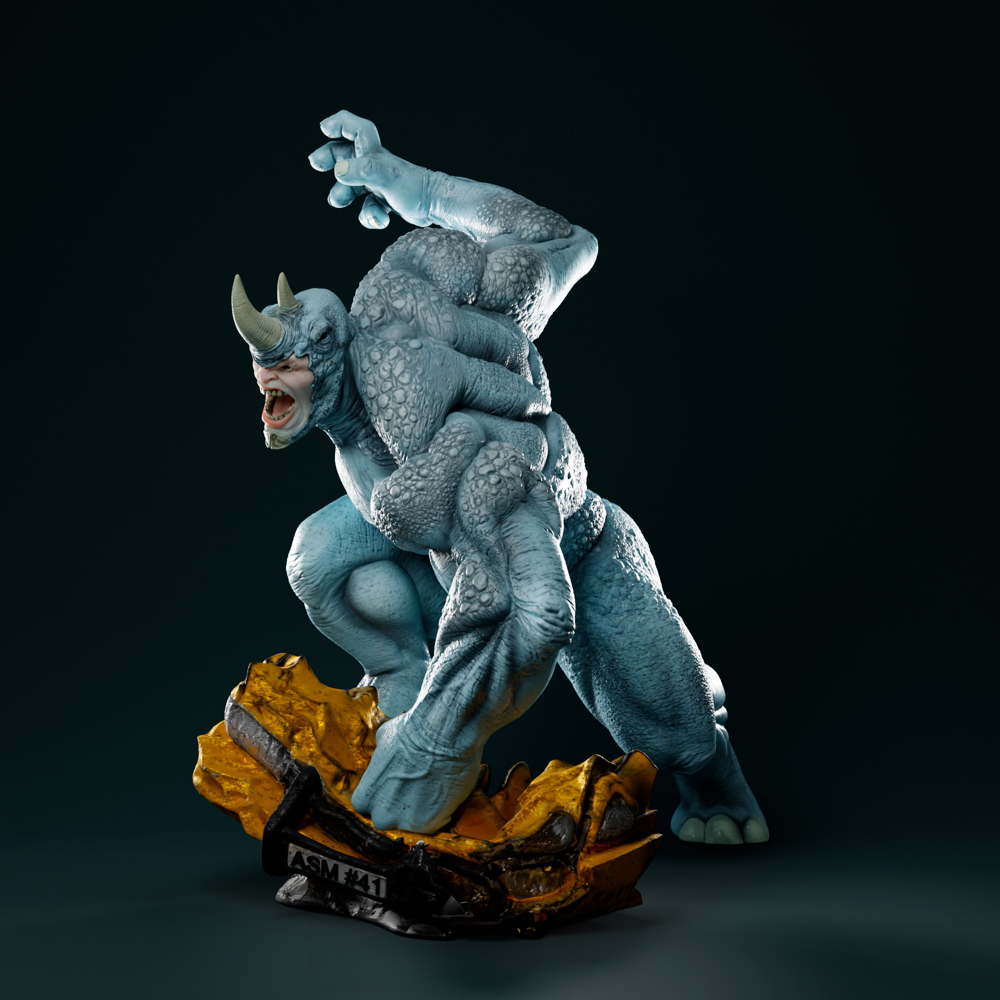A powerful Rhino sculpture, capturing the brute strength, armored physique, and unstoppable force of Spider-Man’s formidable adversary.