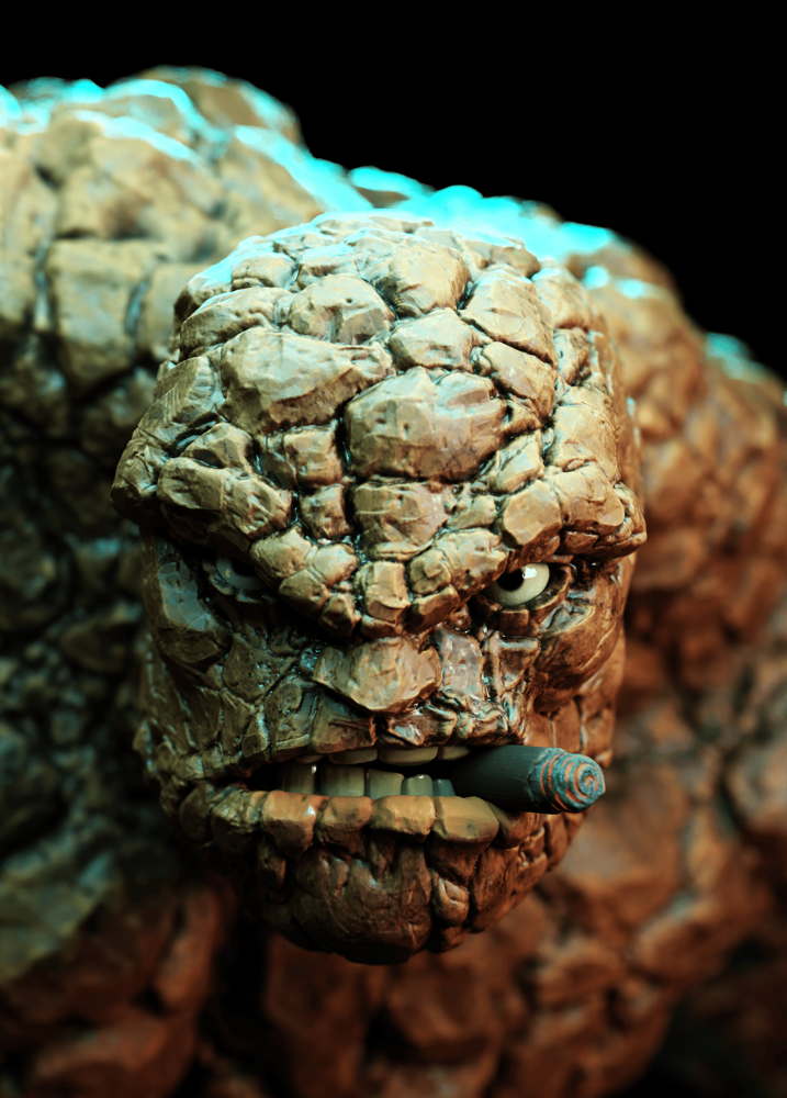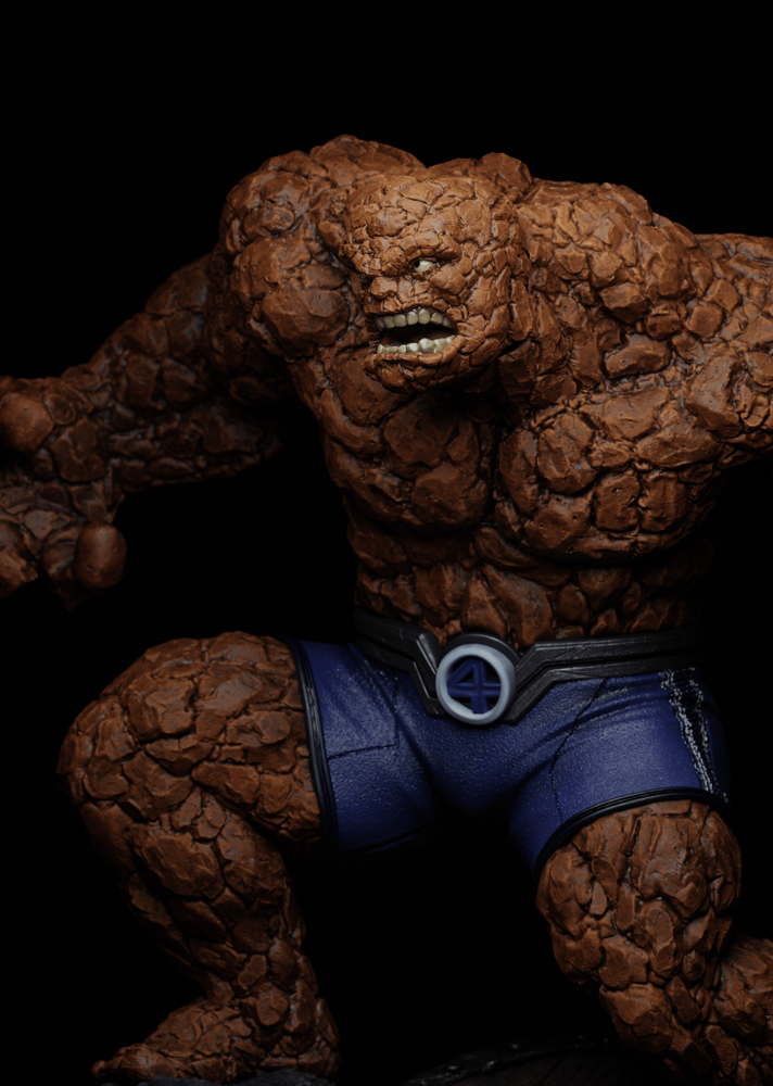 A rugged The Thing sculpture, capturing the immense strength, rocky exterior, and heroic presence of the Fantastic Four’s powerhouse.